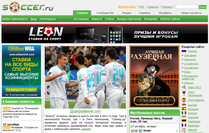 А через год на главной красовалась фотография Скаченко и Смертина – с того самого матча России и Украины! В лого сайта слово «соккер» написали курсивом, а остальные части – обычным шрифтом, зеленый цвет нагрянул в гости. Кроме того, сайт стал двуязычным – определенное время была английская версия для британских фанатов российского футбола: