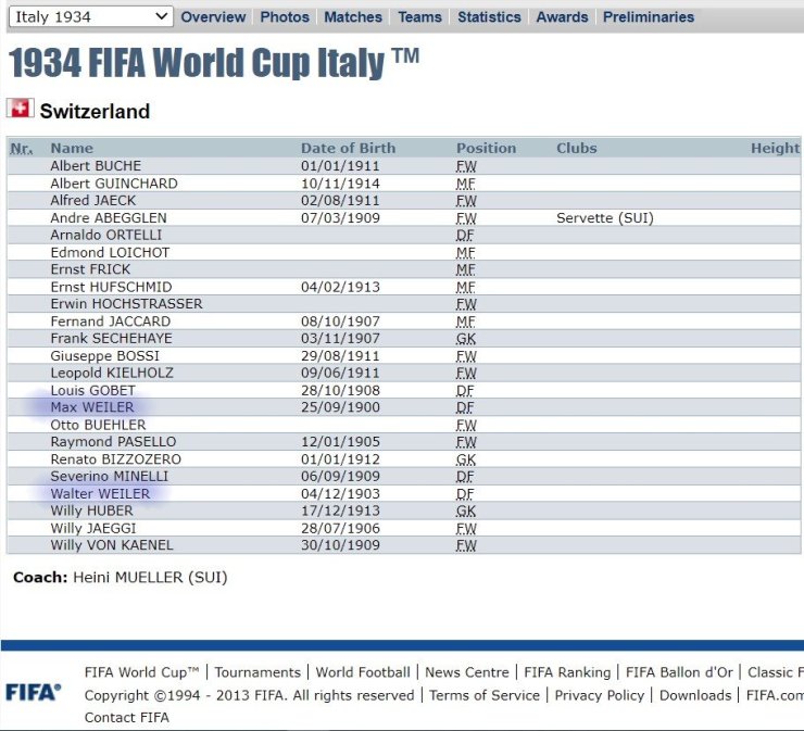 В окончательную заявку попал только младший брат Вальтер Вайлер. Некоторые источники указывают, что старший брат Макс всё-таки был в составе делегации (или туристом, что вряд ли). Но факт остаётся фактом — в составе сборной Швейцарии на турнире Кубка мира 1934 года не было братьев в заявке. Хотя у них столько братьев было за всю историю, что впору с другими поделиться. Например, Абеггленов было трое, а братьев Эгги даже четверо.