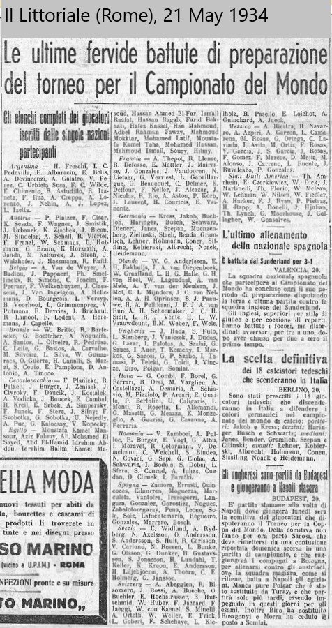 В мае 1934 г. 16 (скорее 17) команд должны были подать в ФИФА заявку на 22 игрока для участия в чемпионате мира. Вот какой текст я обнаружил в швейцарской газете «Neue Zürcher Nachrichten» от 14 мая 1934 г: