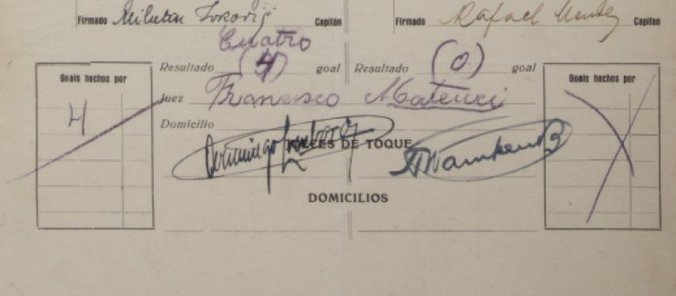 Матч Югославия — Боливия, имена капитанов Милутина Ивковича и Рафаэля Мендеса. Под автографом Матеуччи расписались лайнсмены Доминго Ломбарди и Альберто Варнкен.