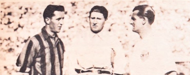 Рефери Мартин Афестегай и капитаны двух уругвайских клубов Эрнесто Маскерони и Хосе Насацци в 1933 году: