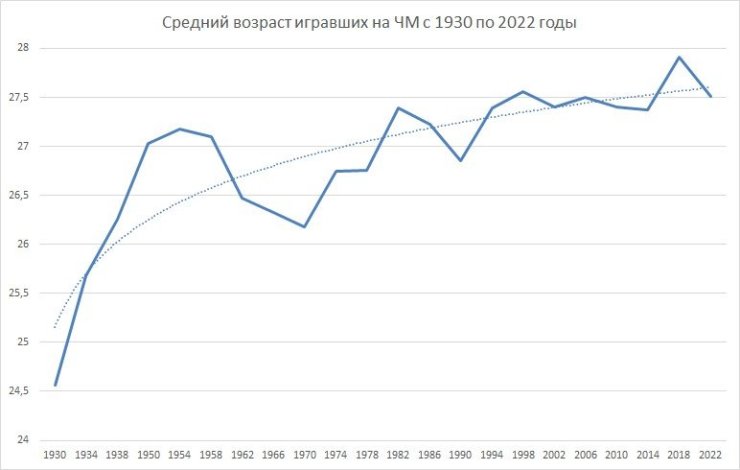 Начнём с обзора среднего возраста всех игравших на чемпионатах мира с 1930 по 2022 годы. Нагляднее всего расскажет об этом график.