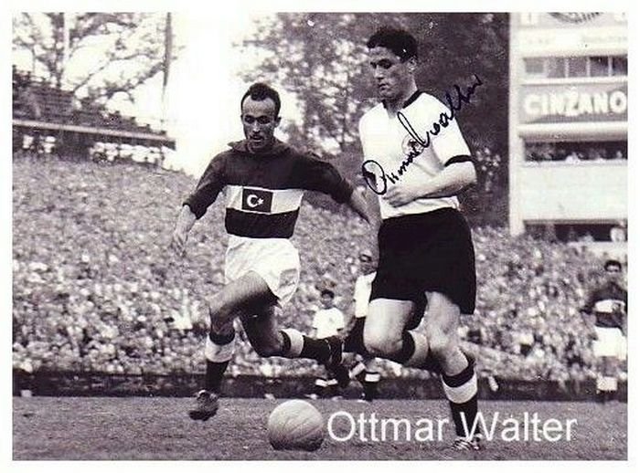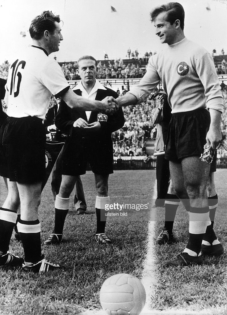 Вот оригинал подписи: 1954 FIFA World Cup in Switzerland First round, Group 2 in the Wankdorf Stadium in Bern: Germany 4 — 1 Turkey (1 -1) — the two sides are entering the pitch| left: the Turkish team with goalie Turgay ahead. Right: the German side with captain Fritz Walter, goalkeeper Toni Turek and Horst Eckel.
