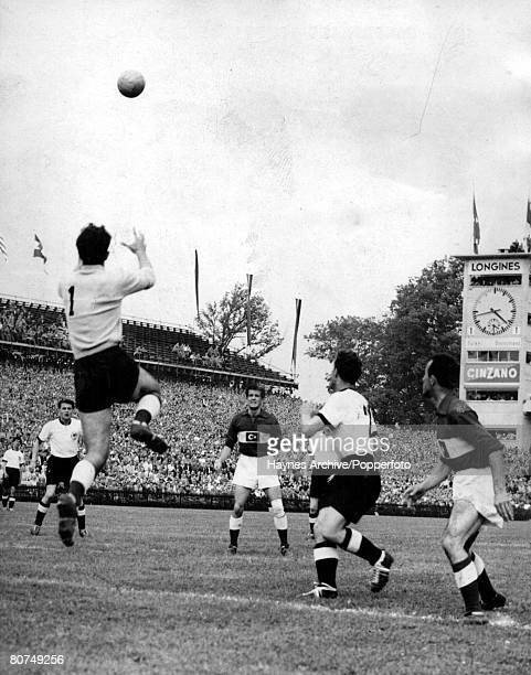 Подпись от ГИ: 1954 FIFA World Cup in Switzerland First round, Group 2 in the Wankdorf Stadium in Bern: Germany 4 — 1 Turkey (1 -1) — Hans Schaefer at a diving header| right: Max Morlock and Ottmar Walter