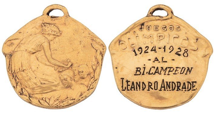 Для одной из тем решил дать наспех найденные в интернете фото именных медалей Хосе Леандро Андраде за победу на Олимпиадах 1924 и 1928 годов. Причём нашлась довольно экзотическая медаль — сразу за чемпионство на двух Олимпиадах, бикампеон.