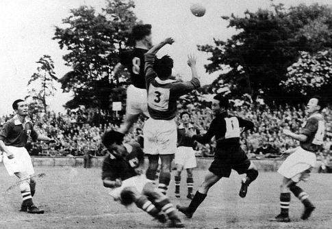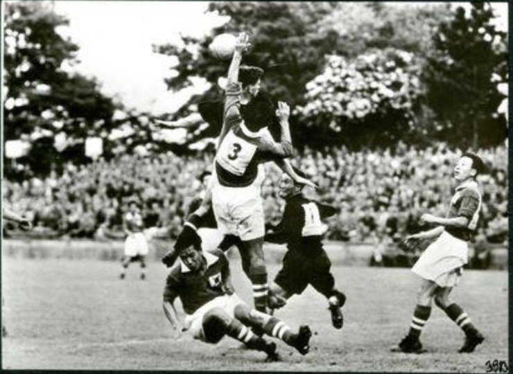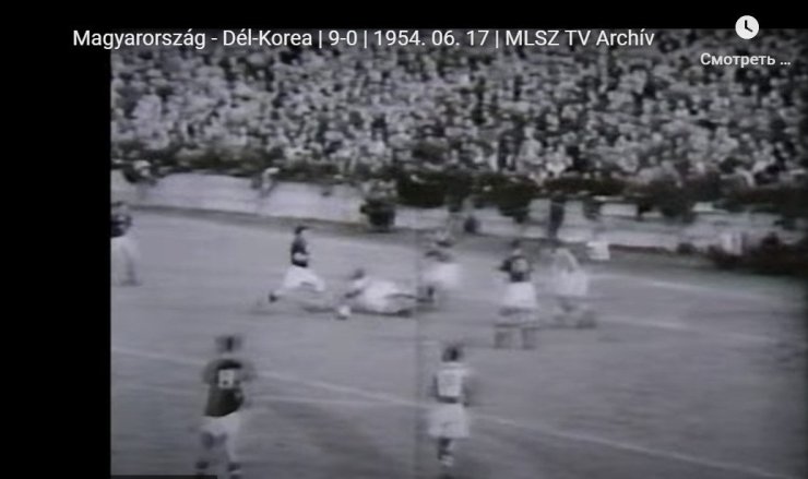 На этом фото кажется, что венгерский игрок слева (Пушкаш?) был в офсайде. Ещё два нападающих сборной Южной Кореи оказались в пределах штрафной площади, но пользы от них было мало.
