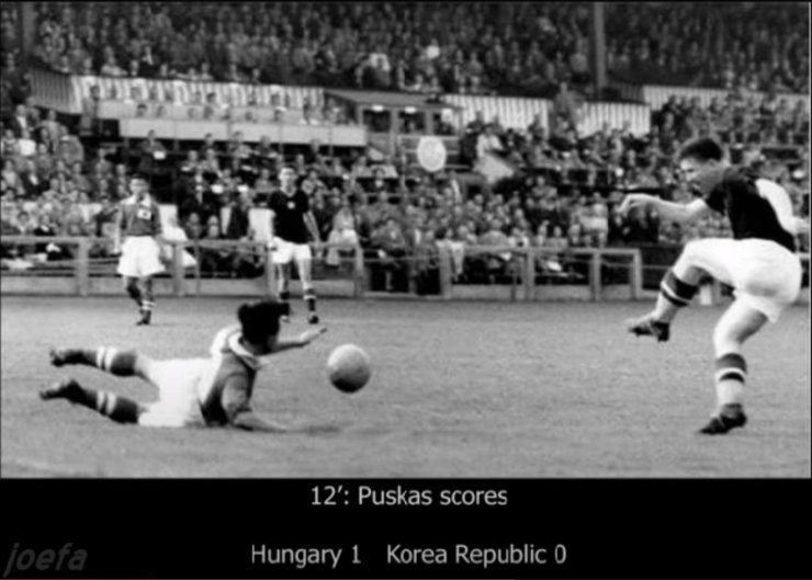 Первые 10 минут игры корейцы продержались, но на 12 мин Ласло Будаи (№16) дошёл с мячом до линии ворот на правом фланге атаки и с границы штрафной площади сделал передачу вдоль ворот, чуть назад. Мяч точно лёг на левую ногу Пушкашу и тот мощно пробил слёта.