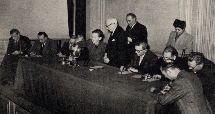 Знаете, ведь кроме широко известного фото с жеребьёвки ЧМ-38 (которое на обложке) — есть ещё одно фото, которое было сделано на минуту-другую раньше. Антураж тот же, стол, господа, шикарный зал и мальчик в шортах на столе. Почему-то это фото не так популярно в сети, редко попадается в поиске:
