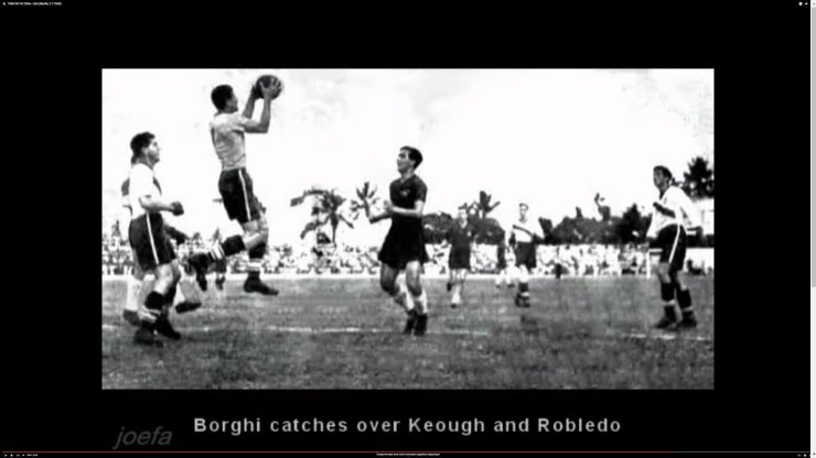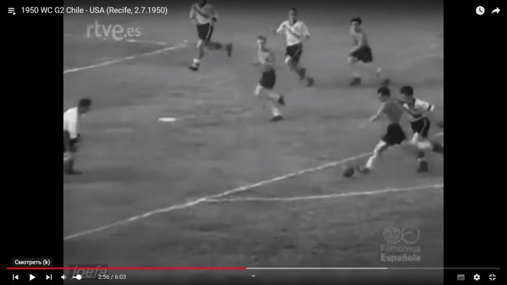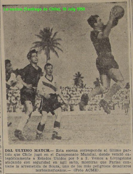 Подпись также неверна. Позади американского вратаря Борги не Харри Кио (Keough), а Чарли Коломбо. Оба из Сент-Луиса, о них в прошлый раз говорили. Коломбо играл в перчатках, а вратарь нет! А Ресифи очень близко к экватору. И мы говорили прошлый раз, что матч был днём, жара под 100 градусов по Фаренгейту (38 по Цельсию). Но Коломбо, похоже, все 3 матча на турнире играл в перчатках, в кожаных, как утверждала та же газета La Nacion.