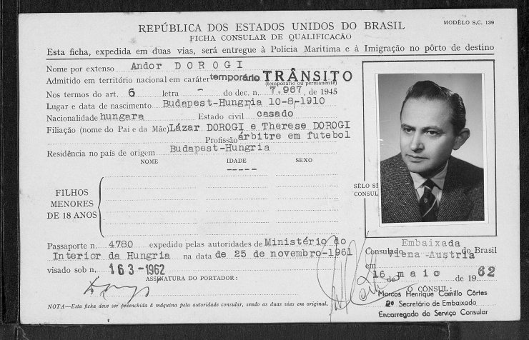 В многочисленных источниках год рождения этого арбитра указано как 1912. Но вот миграционная карточка для въезда А.Дороги в Бразилию в мае 1962, так как прямых авиарейсов из Европы в столицу Чили не было.