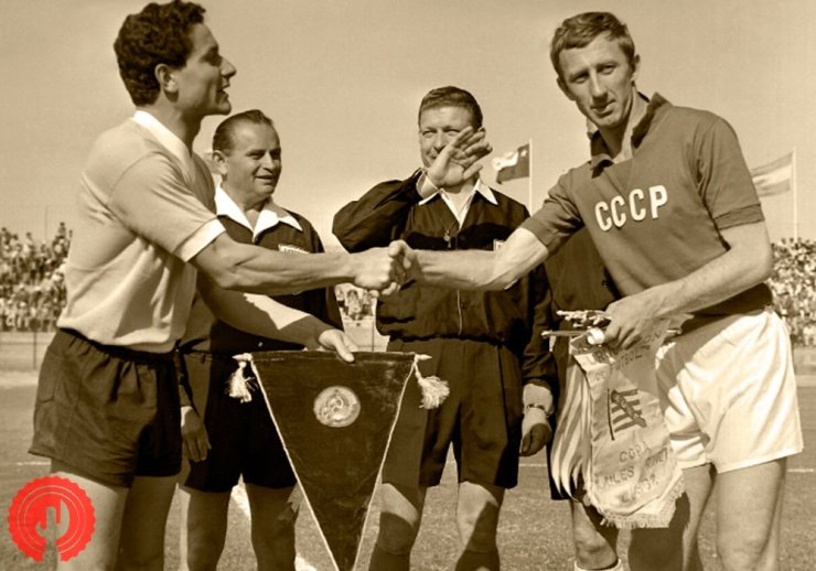 С монеткой в ладонях Чезаре Йонни из Италии. Капитаном сборной Уругвая был совсем не Педро Роча, он и не играл вовсе против сборной СССР тогда. На фото Орасио Троче в качестве капитана. Игоря Нетто вы, думаю, узнали без труда.