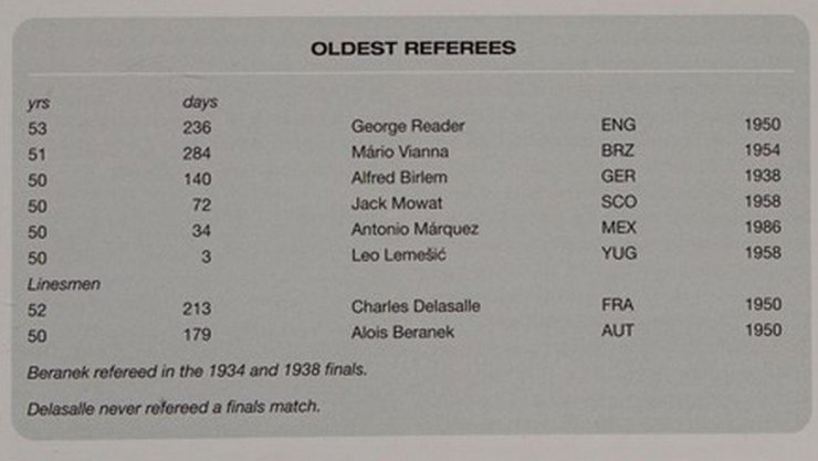 Самой возрастной бригадой из 3 арбитров на Кубке мира является, очевидно, троица европейцев в историческом матче США — Англия на ЧМ-50.