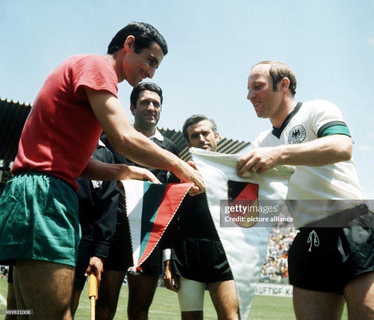 Матч Болгария — Германия на ЧМ-70. Между капитанами Борисом Гаганеловым и Уве Зеелером как раз реф Ортис де Мендибиль. Видим также лицо португальского лайнсмена Антонио Салданья.