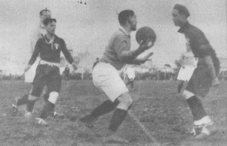 Матч Франция – Аргентина на Парк Сентраль богат на сохранившиеся фото. В основном это прыжки вратаря Алекса Тепо. Хорошее его фото было в прошлой статье. В интернете и масса других фото с его участием в том матче.