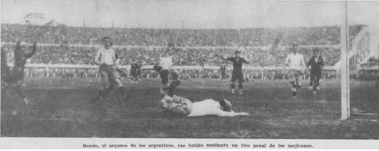Фелипе Росас, Франсиско Гарса Гутьеррес, Рафаэль Гарса Гутьеррес, вратарь оскар Бонфильо с вытянутыми руками, Альфредо Санчес — это мексиканцы слева направо. Аргентинцы Адольфо Сумельсу следит за мячом после своего удара, Гильермо Стабиле готов на добивание. Раймундо Родригес у правой штанги.
