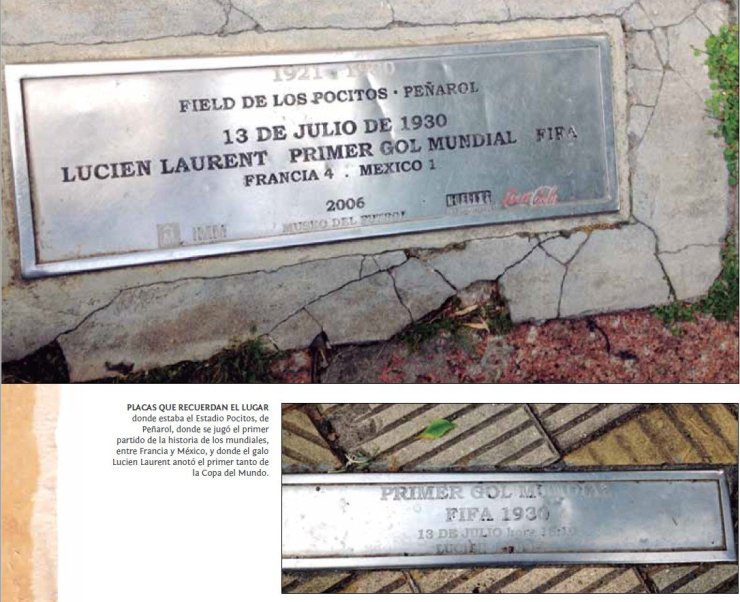 Кстати, после ЧМ в 1933 клуб Пеньяроль перебрался на огромный Сентенарио. А Поситос в 1937 был разрушен до основания, а затем… Затем намного позже (в 2006) высчитали по старым аэрофотосъёмкам место, где были те самые ворота, в который Люсьен Лоран забил первый гол и на этом месте поставили памятный знак. Вернее два знака, один ещё в том месте, где был центр поля. Есть и тексты с пояснениями: