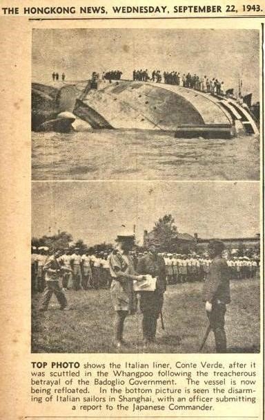 9 сентября 1943 фашистская Италия капитулировала. Конте Верде стояла в Шанхае на реке Вангпу. Итальянский капитан судна Чинеа и его экипаж мастерски затопили корабль на левый борт. Сама команда до последнего была на перевёрнутом судне и лишь в последний момент все погрузились в шлюпки.