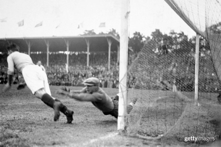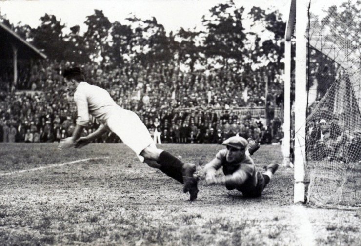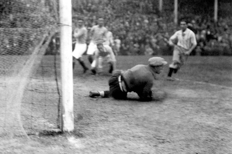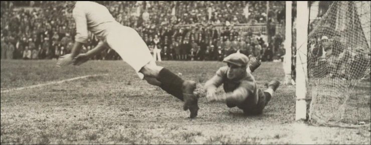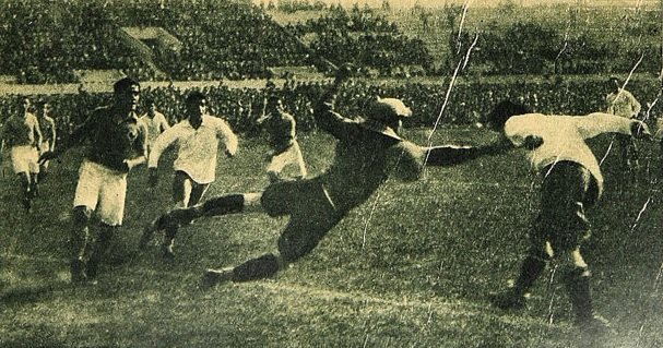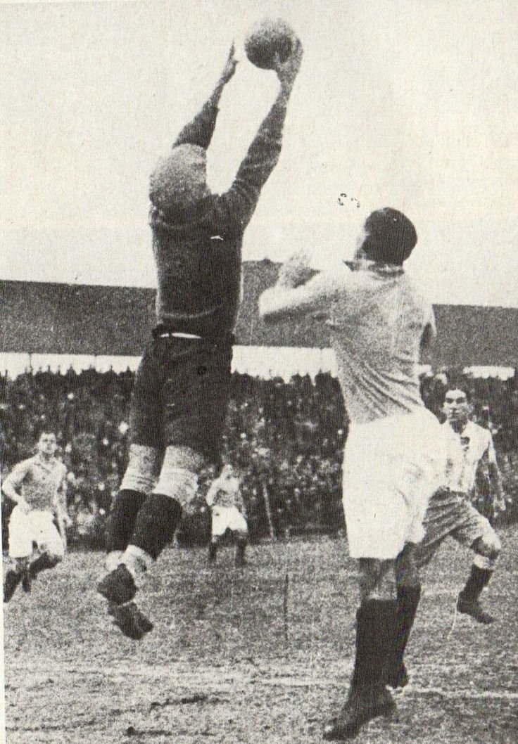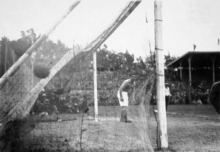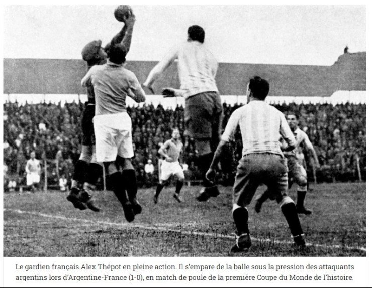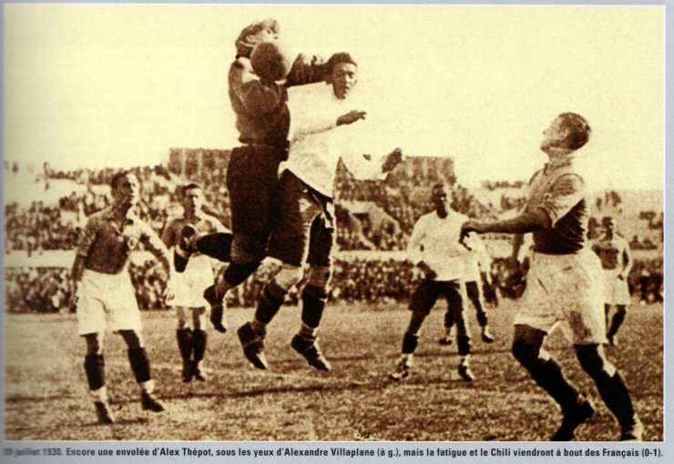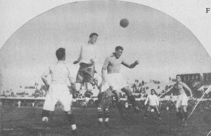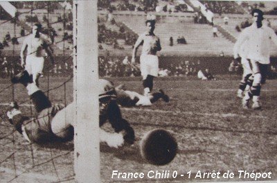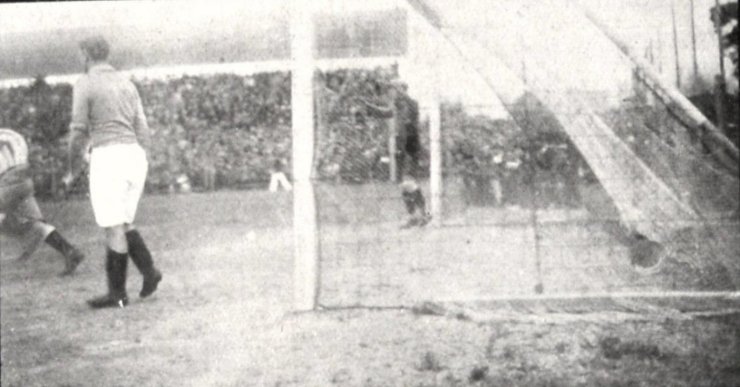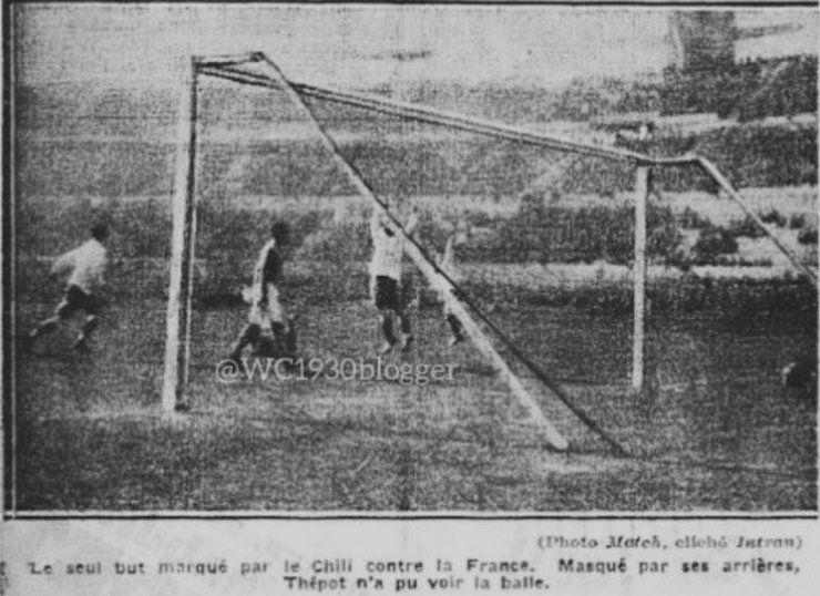 Хорошо известно, что произошло на 19-й минуте матча Франция — Мексика: был забит первый в истории мундиалей гол. Люсьен Лоран, получив справа пас от Либерати, слета послал мяч в ворота мексиканского вратаря Оскара Бонфильо. Этот момент, вероятнее всего, и запечатлён на фото: