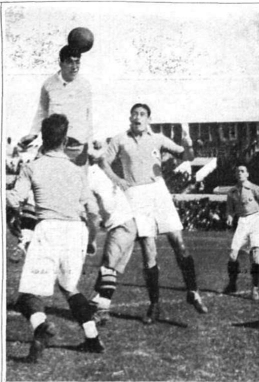 Самым острым у чилийцев был рослый Эберардо Вильялобос. Он и защитник Этьенн Маттлер в воздухе борются за верховой мяч, вероятно, только что отбитый вратарём. Правее видим полузащитника Селестина Дельмера из сборной Франции. Спиной к нам, вероятно, капитан французов Вильяплан, судя по белым подмоткам у щиколоток. Готов к любому отскоку чуть в глубине Гильермо Субиабре.