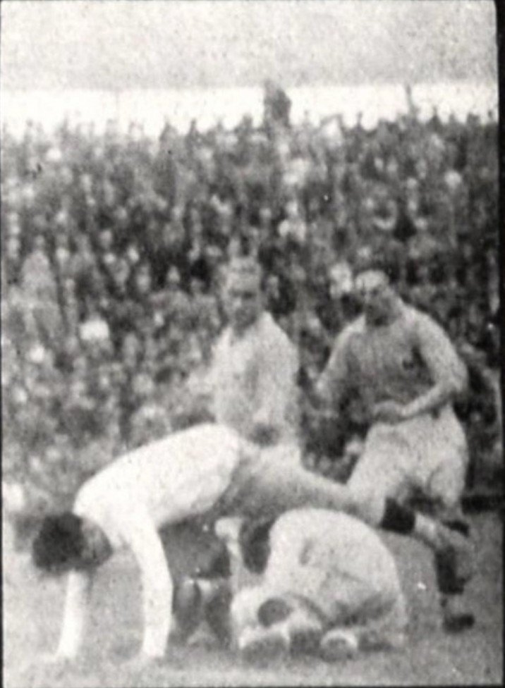 Действующие лица всё те же. Мы видим, что удар головой нанёс француз, которого мы не узнали на предыдущем снимке. Здесь с большой долей вероятности можно сказать, что головой сыграл Эдмон Дельфур, а вот лица Машино на этом фото и не видно.