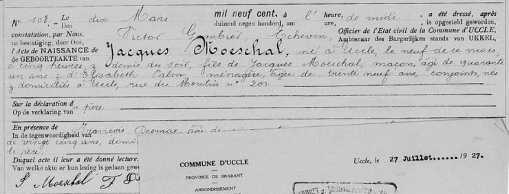 В архивном документе о рождении Жака Мушаля печатный текст дан на двух языках, французский сверху, а рукописный текст только на французском: