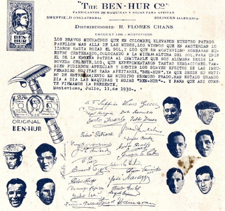 Друзья, успокойтесь. Вот вам автографы всех футболистов и штаба сборной Уругвая, опубликованные в журнале Mundo Uruguayo №606 от 21 августа 1930 года — это обращение к болельщикам, на самом деле это реклама бритвенного станка и лезвий. Подписано было до начала ЧМ-30 11 июля: