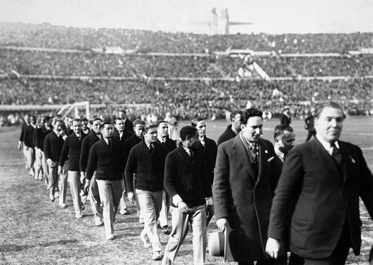 В качестве обложки данной статьи взято фото 18 июля 1930, церемония открытия стадиона Сентенарио, проход делегации Уругвая.