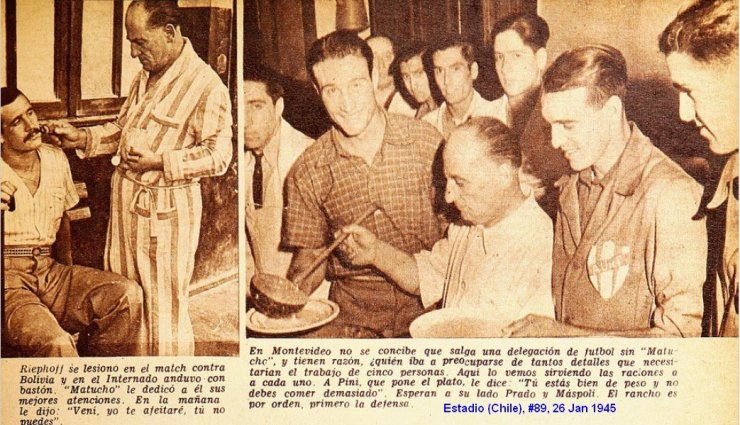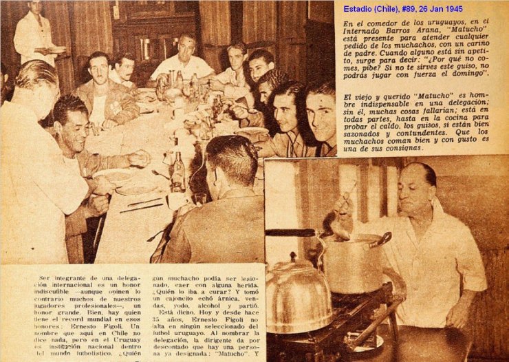 Чилийский журнал Estadio переврал фамилию тренера по физподготовке, который стоит в рубашке с коротким рукавом на этом фото. За столом видим и знаменитого «Матучо» Эрнесто Фиголи. В какой только роли он не был в сборной Уругвая: