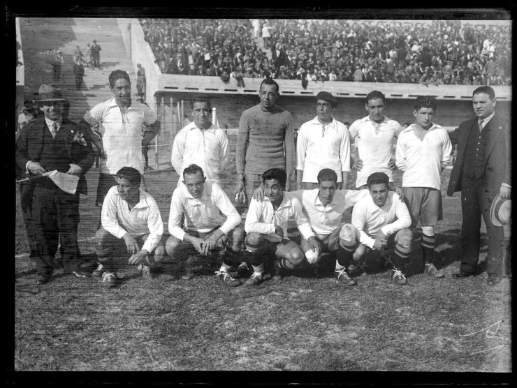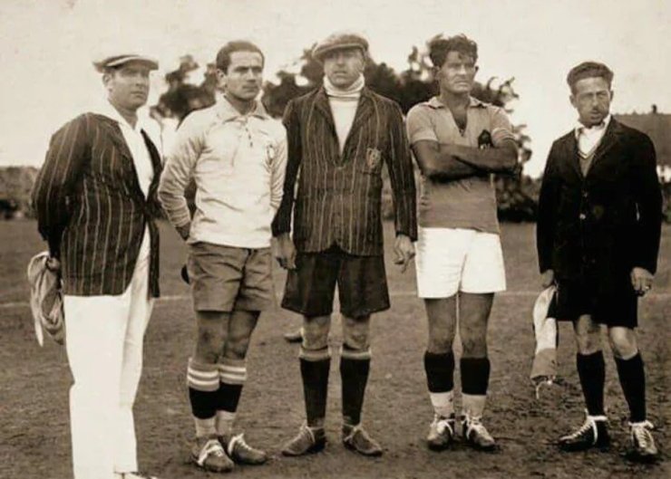 Это матч 14 июля на стадионе Парк Сентраль между Югославией и Бразилией. Капитаны команд бразилец Прегиньо и Милутин Ивкович. Слева по фото лайнсмен Ricardo Vallarino, уругваец. Он знаменит тем, что первым в истории зафиксировал «гол олимпико» в матче Уругвая и Аргентины. Справа по фото стоит француз Жорж Бальве. О не простой ситуации, в которую попал этот арбитр, едва ступив на берег Южной Америки с корабля Конте Верде — в моей ранней статье здесь.