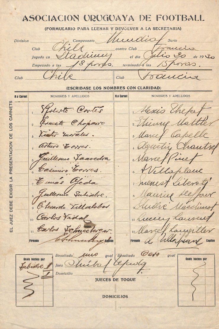 Обратили внимание на дату матча? 20 июля. Но в эту дату французы не играли, как и чилийцы, дело было чуть раньше, 19 июля. Очередная ошибка в протоколах. Можете назвать это и загадкой.