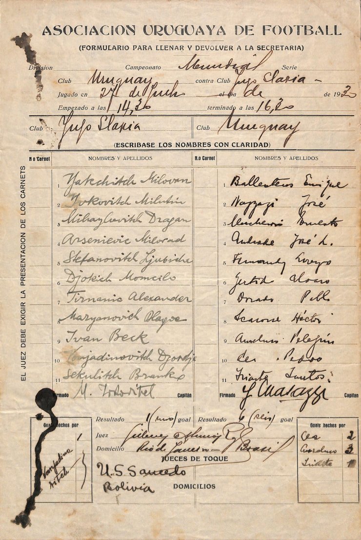 Видно, что с бразильской стороны чуть ли не полные имена (а они у бразильцев длинные) писал сам капитан Прегиньо (полное имя Жоао Коэльо Нетто). Сам и автограф свой оставил. Кто заполнял протокол с югославской стороны — сказать трудно. Единственно что можно сказать — фамилии игроков написаны не по-сербски, а на английский манер, как в заграничных паспортах, у всех (практически) фамилии оканчивались на itch. Их так в прессе и звали — команда itch-ей. Но в других их протоколах писали и иначе.