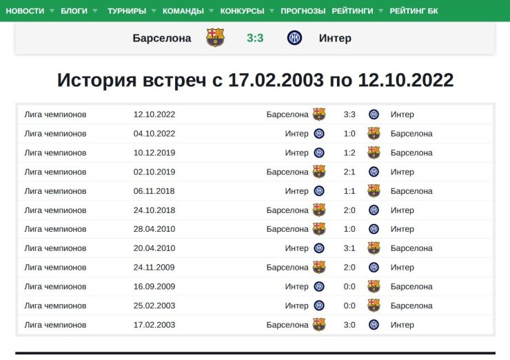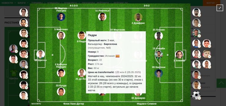 Нажав на «На весь экран» в правом верхнем углу расстановки, получите доступ не только к расширенной версии, но также к информации о футболистах. Например, узнаете поближе участников схватки «Барселоны» с «Интером» в полуфинале Лиги чемпионов. В меню матча можно посмотреть историю встреч. Полезно перед тем, как делать прогноз на поединок.