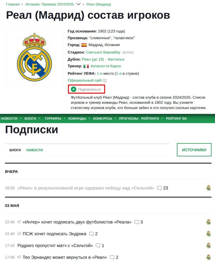 Ещё одна полезная фишка, если у вас есть любимый игрок или клуб – подписка. Достаточно добавить свою команду, а потом в меню профиля перейти на вкладку «Подписки». Не пропустите важные новости.