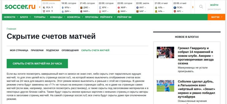 Если решили отдохнуть от Сети, но не желаете сразу узнать результат важного матча после возвращения и хотите посмотрите его в записи, то пользуйтесь простым адресом. Функция позволит скрыть результаты матчей и таблицы на 24 часа.