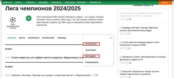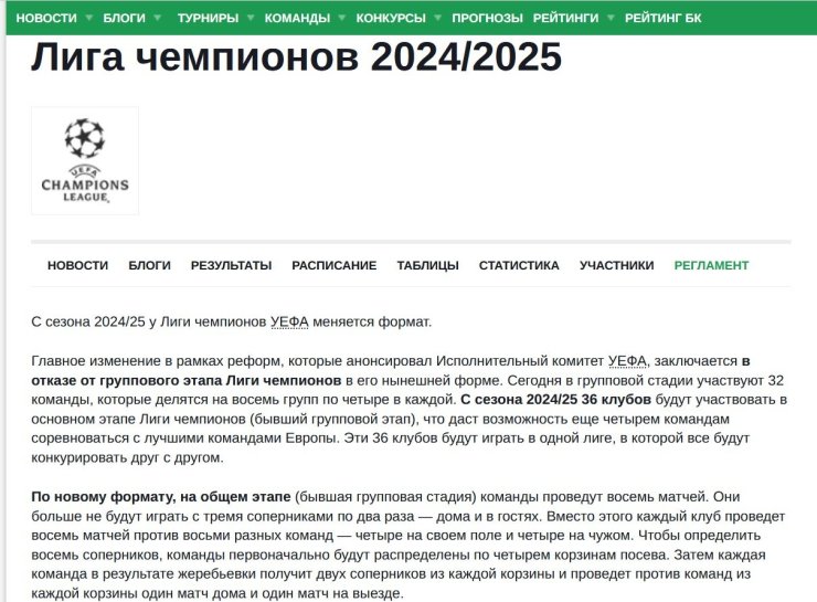 В конце сезона особенно актуальны правила турниров. Вкладка «Регламенты» позволяет понять, как изменился формат Лиги чемпионов и будет ли «золотой матч» в Серии А при равенстве очков между «Интером» и «Наполи».