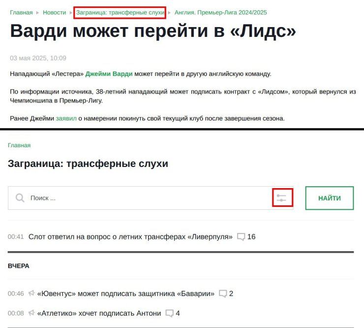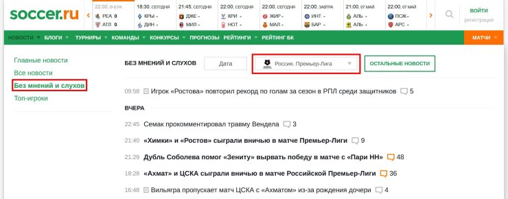 Полезна строка поиска в новостях. Экономит время и позволяет найти нужного игрока или клуб. Также обратите внимание на выделенное ниже меню. Новости отсортированы по категориям. Удобно кликнуть на «Заграница: трансферные слухи» и получить набор новостей по теме. Ещё есть рубрики с юмором и красивой игрой в футболе, от финтов до фейр-плей.