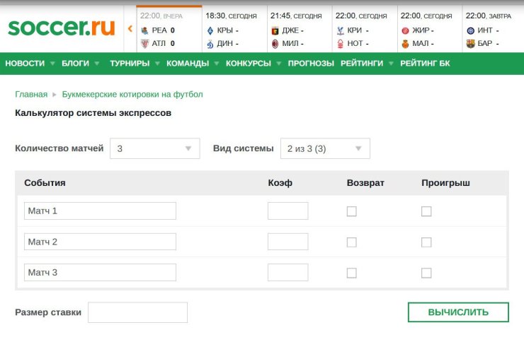 Также важная страница – калькулятор системы экспрессов. Поможет разобраться по пути к победной ставке.