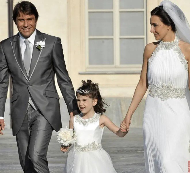 Когда Антонио переехал в Турин, чтобы играть за «Ювентус», он встретил Элизабетту, красавицу-дочь своего соседа и друга по имени Джанни. Конте долго наблюдал за девушкой – ждал идеальный момент, чтобы начать знакомство. И в один из дней Конте пошел в атаку, на дворе был сентябрь 2004 года. Элизабетта заглянула в бар на Корсо Винцальо, чтобы поздороваться со своим отцом, и увидела Антонио. Он в это время рассуждал о футболе за чашкой кофе, этот напиток Конте любит до сих пор. Было достаточно одного взгляда, чтобы появилась искра, из которой постепенно образовалось пламя – родилась дочь в 2007 году, назвали Витторией. Девять лет Антони и Элиза встречались, а потом сыграли свадьбу. Это было уже после рождения дочери, в 2013 году.