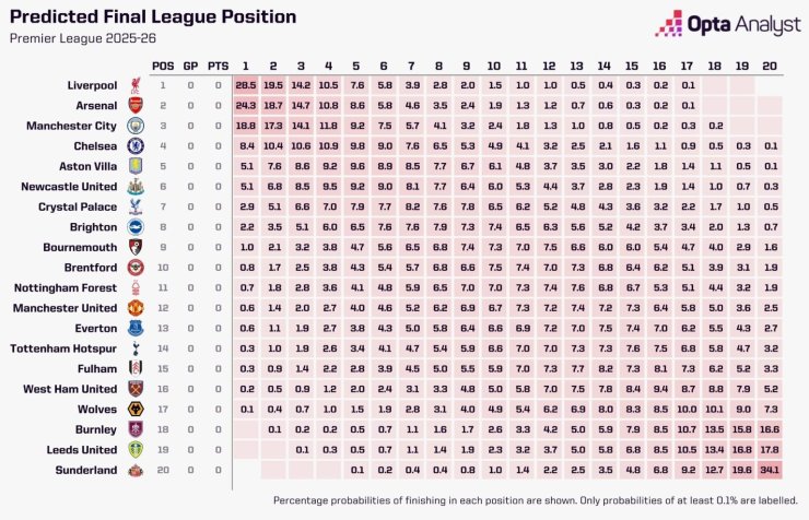 В Англии кому-либо тяжело будет пройти путь без заметных осечек. Многие известные клубы сразу встретятся между собой, что усложняет идеальный дебют. «Арсенал» в первом туре сыграет против МЮ, а на третьей неделе сезона встретит «Ливерпуль», и оба матча «канониры» проведут в гостях. У команды Слота встречи против «Борнмута» и «Ньюкасла» до игры против Артеты. «Манчестер Сити» сыграет против «Тоттенхэма» и «Брайтона», а чуть позже их ждёт дерби против МЮ. Высокие проценты лишь у тройки клубов после тысяч симуляций матчей сезона, но за места в зоне Лиги чемпионов будут сражаться середняки в таблице ниже: