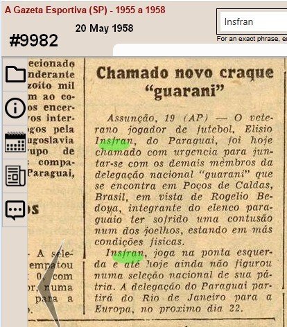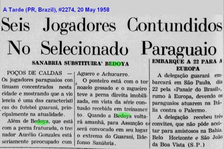 В тот же день 20 мая 1958 в другой бразильской газете, но из Сан-Паулу, сообщали, что вместо Бедойя в сборную Парагвая вызван Элихио Инсфран: