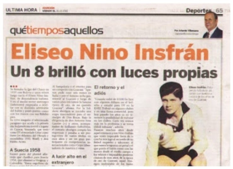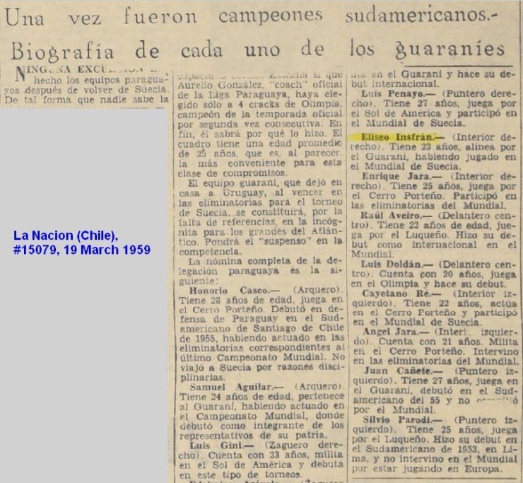 Есть сайт этой газеты, есть поиск архивных статей, года с 2010 кажется. Но этой статьи найти не удалось. Мой парагвайский знакомый, историк (не только по теме футбола) Альберто Кандия (ударение на А в фамилии) спросил про такую газету у сына Элисео Инсфрана в соцсети f. Я также спросил у сына Элисео про родство его отца и Элихио Инсфрана. Пока ответов нет. Подождём. Небыстрый это процесс — отклики родственников.