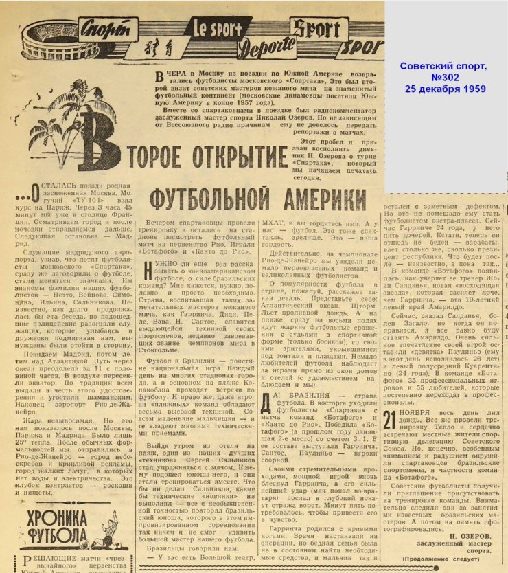 Как я уже сказал, Советский спорт рассказывал о прошедших матчах Спартака в Южной Америке по горячим следам.
