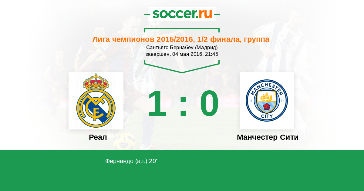 Приветствуем всех поклонников футбола на ответном матче полуфинала Лиги Чемпионов между испанским "Реалом" и английским "Манчестер Сити". На "Сантьяго Бернабеу" в Мадриде команды будут определять, кто станет вторым финалистом Лиги чемпионов. Неделю назад в унылому поединке, который состоялся в Англии, соперники разошлись миром, не забив при этом ни одного мяча. Поможет ли преимущество своего поля и значительно больший опыт выступлений на подобном уровне "сливочным" отпраздновать итоговую победу? Сайт http://www.soccer.ru проведёт прямую текстовую онлайн трансляцию матча, следить за событиями на поле и комментировать игру будет Старчеус Сергей.