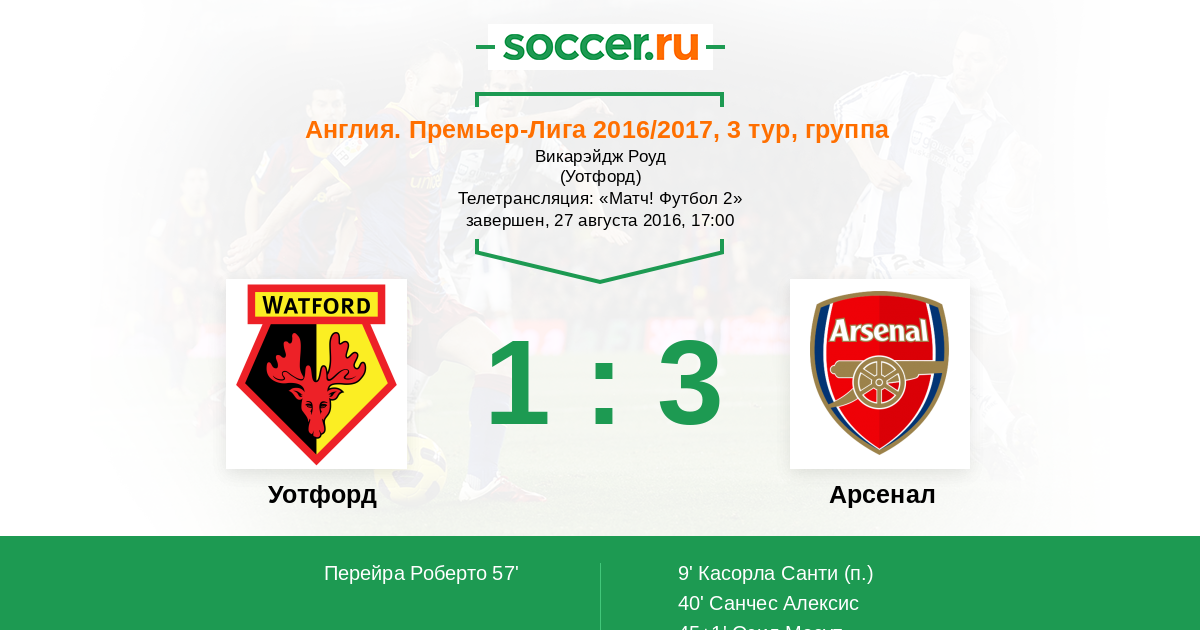 Все! Матч закончен! Лондонский "Арсенал" благодаря трем забитым голам в первом тайме обыгрывает на выезде "Уотфорд" и кладет в свою копилку три очка! Голы за "канониров" забивали Санти Касорла, Алексис Санчес и Месут Озил, в составе "шершней" гол престижа забил Роберто Перейра. Итоговый счет поединка - 3:1 в пользу лондонского "Арсенала". Предлагаем Вам выбрать лучших игроков в составах обеих команд: http://www.soccer0001.com/matches/ratings/1010734.shtml. Для Вас онлайн-трансляцию поединка провел Андрей Бабенчук. Оставайтесь на http://www.soccer.ru/ !