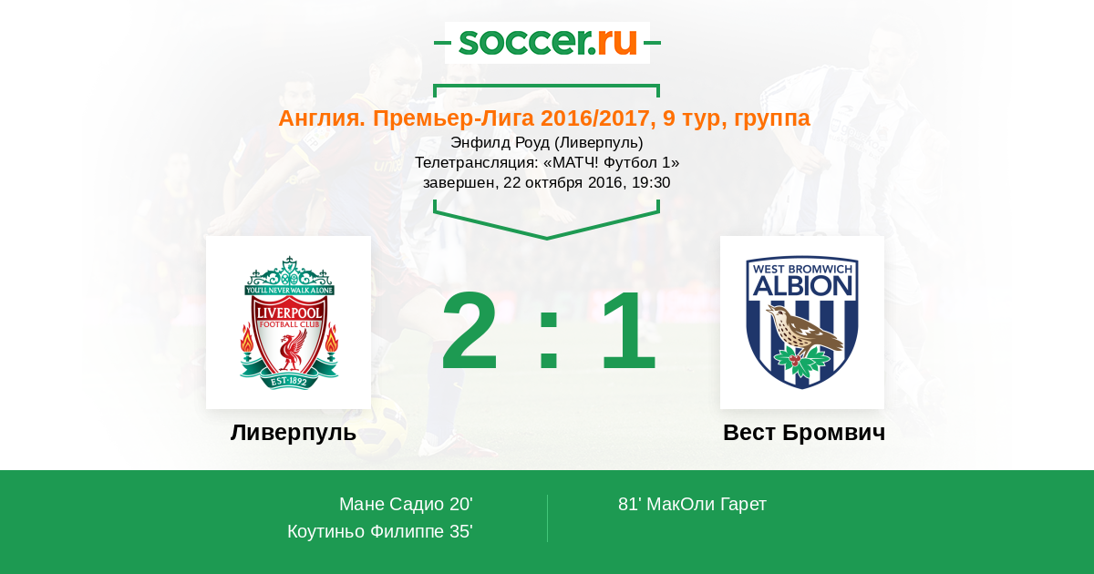 Подопечные Юргена Клоппа за матч создали кучу голевых моментов, но реализовать смогли только два, чего в принципе хватило для победы! "Ливерпуль" уверенно провел первый тайм и половину второго, а затем "красные" сбавили обороты, и у "дроздов" стало получаться опасно атаковать! Не смогла команда Тони Пулиса сравнять счет, хотя если честно шансы пропустить третий мяч у "Вест Бромвича" были намного выше нежели забить второй! Предлагаем выбрать лучших игроков в составах команд, комментировал для вас Дмитрий Отмахов. До новых встреч на soccer.ru.