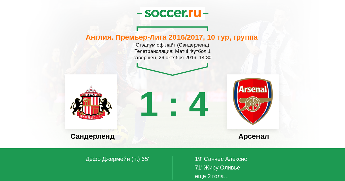 Финальный свисток! "Канониры" громят хозяев поля благодаря дублям Алексиса Санчеса и Оливье Жиру. 1:4 на "Стэдиум оф лайт" позволяет "Арсеналу" продолжить борьбу за лидерство и доводит количество поражений "Сандерленда" в этом сезоне до восьми. Напоминаем, что Вы можете выбрать лучших игроков матча в составе обеих команд. Текстовую онлайн-траснляцию провёл Глеб Васильев. Оставайтесь на "Соккер.Ру"!