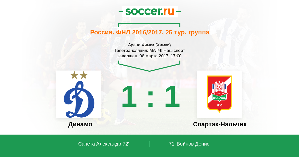 Добрый день, уважаемые пользователи «Соккер.Ру»! Футбольная национальная лига возвращается, сегодня мы отправляемся на «Арену Химки», где лицом к лицу сойдутся московское «Динамо» и «Спартак» из Нальчика. Данное противостояние обещает быть интересным, ведь «бело-голубые» возобновляют сезон в качестве лидера, а южане пытаются сохранить прописку в ФНЛ. Текстовую онлайн-трансляцию проведёт Глеб Васильев. Начинаем в 17:00!