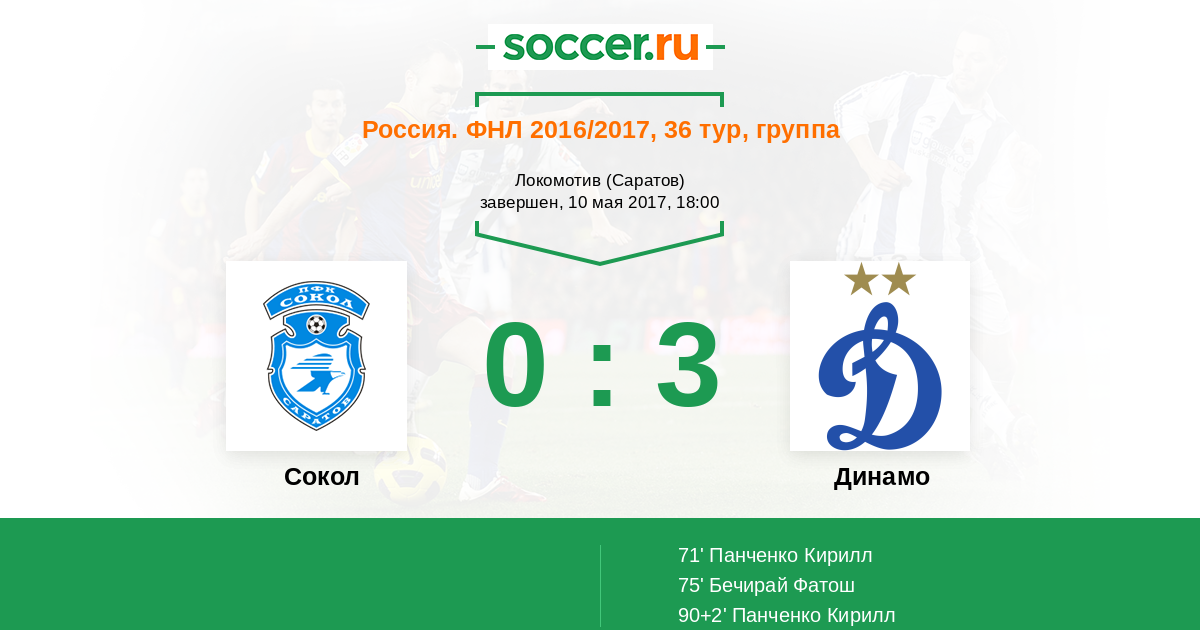 Все! Матч завершен! "Динамо" одержало тяжелую выездную победу над "Соколом" со счетом 3:0! Дублем в этом матче отметился Кирилл Панченко, еще один гол в свой актив записал Фатош Бечирай. Целый матч команды провели под проливным дождем, погодные условия внесли серьезные коррективы в игру. Забить "динамовцам" удалось только во втором тайме, стоит отметить удачные замены в составе "Динамо". Предлагаем Вам выбрать лучших игроков этого поединка в составах обеих команд. Для Вас прямую онлайн-трансляцию этого матча провел Андрей Бабенчук. Оставайтесь на https://www.soccer.ru/!
