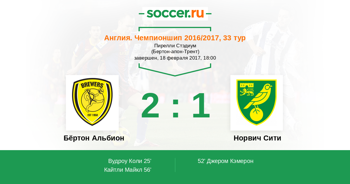 Бёртон Альбион - Норвич Сити: обзор матча 18 февраля 2017
