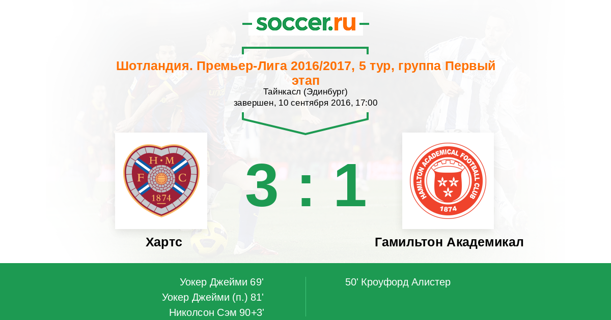 Хартс - Гамильтон Академикал: обзор матча 10 сентября 2016